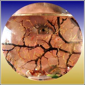 照片上,一只眼睛密切注视着一个独立的生态系统。在这个小生态系统中,所有的生物体都相依为命,整个球体所必须的维持条件是阳光。有了阳光,这个类似于地球的小生态系统中的植物就可以制造氧气,从而维系其它生命体的生长。