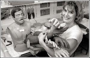 照片上,一位临床技能指导教师抱着一堆假肢。这些假肢被用于帮助学生掌握重要的临床医疗技巧。