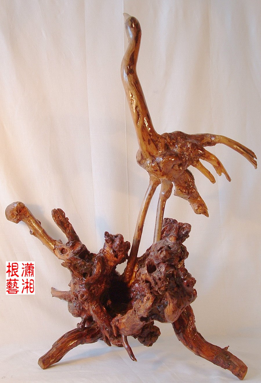 我认为最好的根雕作品就是要七分天成,三分人就!如果是十分天成,那么就不能说是根雕,那是神话,大自然给予我们的神话!如果是七分人就,三分天成,那么只能说是雕根,而不能说是根雕!不知各位是否认同我的观点呢?如果有哪位朋友对我的话说的有点道理或是不认同,都可到我的—— 潇湘根艺 网站来讨论。我的网址是: http://xxgen.51.net !里面的根雕作品可都是我自个做的哟!欢迎志同道合的朋友进来交流!下图就是其中一些作品: