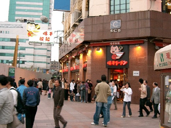 我是在抗日游行后到的上海,在上海7天,一直在南京东路闹市区活动,每天中午和下午都看到这么一个景象,我很生气,虽然没什么后果。位于步行街口的日本面馆怎么天天都排大队呀。