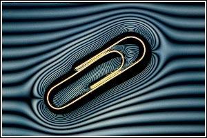 “表面张力”/爱因斯坦年奖(Einstein Year Award) 作者:罗伯特·安德森(Robert Anderson)。 从照片上我们可以看到,水的表面张力甚至能够托起一枚金属曲别针。照片的作者在拍摄时,在光源的前面放置了一个铁格子,这样人们就能看到由曲别针重力引起的水面变形。这种光线弯曲就和受强重力场影响的光线弯曲相类似。水是由许许多多的水分子组成的。水表面的水分子紧紧靠拢在一起,有一种相互吸引的力,这就是水的表面张力。