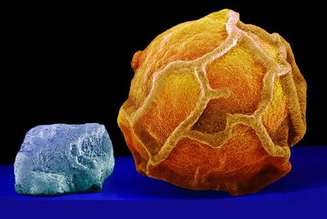 特写镜头类:第1名“盐和胡椒”(“Salt and Pepper”);作者:大卫·麦卡锡(David McCarthy) 照片的作者大卫·麦卡锡是伦敦药剂学校的一位研究人员。他使用一台电子显微镜拍下了一个胡椒子和一粒海盐的特写照片,让人们清楚地看到了这两种生活中常见的物体的真实构造。