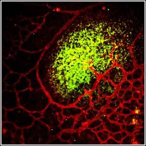 高度推荐奖“新血管的生长”(New blood vessel growth);作者:大卫·吉普森(David S Gibson)。 血管并非是被动的,它们会积极主动地搜寻体内低氧的区域,并在其中成长。在这个视网膜网络中,其中低氧区域(绿色部分)已经被视网膜网络发现。视网膜网络已向其伸出了手指一样的突出部分。这种突出物将指导新血管的生长,以向这一区域提供氧化血。