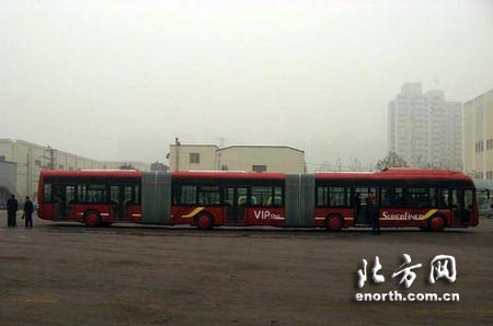 25米长公交车现身北京 市民质疑其行驶困难(图) 北方网车讯:近日一辆25米长、三节车厢的红色公交车成为网上很多论坛的新话 题。 一张命名为“超级公交车”的帖子被众多论坛转载,里面说这辆车将作为从安定门到 立水桥的快速公交,明年投入运营。但记者就此事咨询公交集团时,对方表示集团没 有发布过这类信息,是否会引进这种车作为快速公交,目前还不好说。 网上热议“超级公交” “以后,家住在天通苑的和北苑的就有快速公交坐了。这条从安定门到立水桥的 快速公交,明年就开始投入运营了,现在司机正在试驾和训练。”这个名为“北京即 将开通一辆超级公交车”的帖子11月27日一出现在“巴士中国”的论坛上立刻引起热 议。 对于这辆三节车厢、25米长的庞然大物,网友们最关心的是它将如何行驶。“我 觉得这辆车进出站、转弯和掉头都成问题。”一位网友表示,“如果真按帖子里说的 ,行驶在安定门到立水桥,恐怕开起来会很困难。” 而这张帖子在“家住天通苑”的论坛上,网友关注的则是这趟车什么时候能够开 通。“我们这个论坛的成员基本上全是天通苑的业主,自己的出行问题自然是最大的 关注点。”一位网友说,“一直以来出行问题都让天通苑地区的业主感到头疼。” 当这张帖子被CHINAREN的BBS转载后,传播立刻开始加速。同时,质疑的声音也 开始出现,这件事是不是真的?神秘的超长公交是哪来的,又在北京什么地方出现? 神秘超级公交现身马管营 记者了解到,最早刊载这辆神秘的“超级公交车”的是北京公共交通论坛,而后 在11月27日被巴士中国的网友转载,图中的位置是丰台区马管营的加气站。据一位亲 眼见过这辆公交车的网友介绍,车是浙江青年汽车集团的产品,技术来自德国尼奥普 兰公司,和我市目前运营的快速公交系出同门。 “当时我正好路过那里,看到这辆奇怪的车立刻被吸引了。”网友涂涂说,“当 时它停在马管营的公交总站里,我上前询问,发现看车的很多人都是公交集团的工作 人员。” 涂涂的话在公交集团一位姓姚的处长那里得到了证实。“我是去看过这辆车,也 上去坐了坐,觉得车确实不错。”姚处长表示,“当时我主要是从技术角度去考察的 。” 公交公司表示是否引进还未定论 对于网上说这辆车将作为安定门到立水桥快速公交的传言,姚处长表示现在还难 以定论。“他们带车来主要是征求意见,目前这辆车会在哪用,国家是否允许批量生 产等很多情况还不能最后确定。” 记者了解到,根据北京市交委规划,2008年前北京将在南中轴路、安立路、广渠 路、朝阳路、阜石路和林翠路上建设大容量快速公交。这6条线路共需300辆左右的专 用车辆。至于其中会不会有线路使用这种型号的车,目前尚无定论。