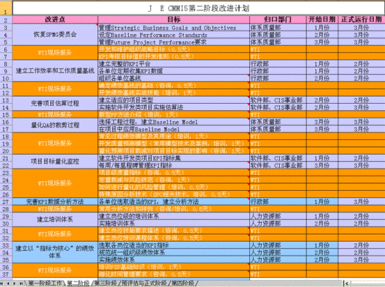 C. 当初实际的工作记录: 2006年11月改进计划 【策略】在保持CMMI3能力的基础上,通过KPI,建立过程绩效基线和模型,并选择项目进行量化项目管理; 【重点】 ○ 统一的过程管理工具平台; ○ 组织、部门和岗位KPI体系开始正常收集数据; ○ 绩效体系配合KPI体系正常运作;(研发过程度量体系) ○ OPM